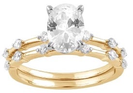 This dazzling bridal set features lab grown diamonds shimmering in 14-karat yellow gold, and a romantic design. A single oval-cut lab grown diamond takes center stage on the engagement ring, with brilliant-cut lab grown stones adding sparkle on the band.