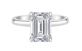 A timeless solitaire engagement ring featuring a luminous emerald-cut lab-grown FG VS diamond with a hidden halo, all set in 14-karat white gold.