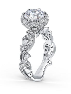 This romantic ring setting features swirls of 18-karat white gold lined with shimmering diamonds and milgrain detail. *Please note that the center stone is sold separately.