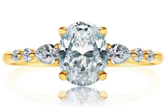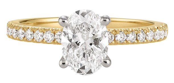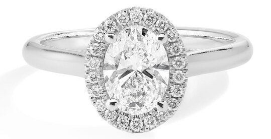 Available in yellow and white gold, this ring captures the classic yet eye-catching essence of Hayley Erbert’s ring. One oval diamond sits on top of a hidden halo of small sparkling diamonds on this timeless ring.