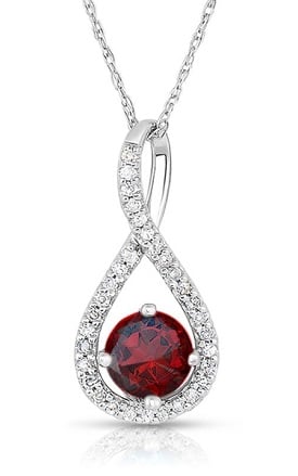 This garnet infinity design drop pendant features a genuine round gemstone center surrounded by diamonds, all set in sterling silver. 18.2 x 8.9 mm