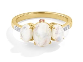 From our exclusive JK Crown Collection, three moonstones are accented by shimmering diamonds and bright pink tourmaline gemstones, all set in 10-karat yellow gold.